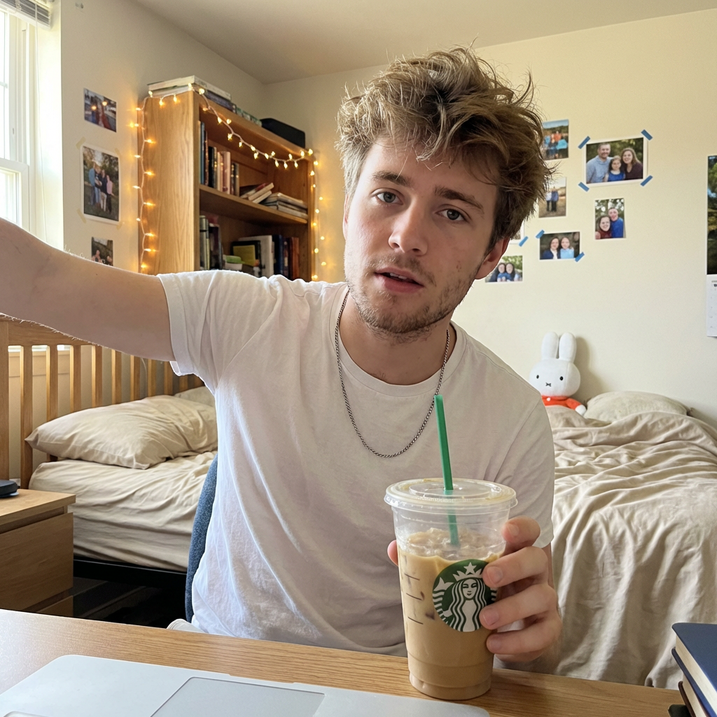 A young man with light brown hair and light stubble is in a bedroom, holding a Starbucks iced coffee in his right hand, with a green straw in it. He is wearing a slightly open low-cut crew neck white t-shirt with a thin silver chain necklace visible. His left hand is reaching out behind the camera. In the background, there is a bed with rumpled beige bedding, a wooden headboard, and a bookshelf filled with books and decorative items. String lights are draped along the top of the bookshelf. Family photos are stuck to the wall behind him in a random, unorganized layout. A Miffy plush toy sits on the bed. The lighting is natural and bright. iPhone UGC style photo, as if he is a TikToker filming a casual get-ready-with-me video. No phones or cameras visible. Low angle shot as if the camera is propped up on his desk.
