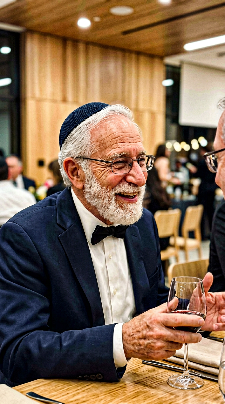 Candid iPhone photo, natural smartphone camera look. A 75-year-old man with fair aged skin, wrinkles, rectangular wire-frame glasses, wearing a dark navy kippah. White silver hair swept back, full white beard neatly groomed. Dark formal suit jacket with black bow tie over white dress shirt. Wise warm expression, like he is mid-conversation. Indoor lighting, warm overhead lights. In a modern room, light-colored panels blurred behind him. Casual candid photo, slightly imperfect framing, natural colors. Not a professional photo. Looks like someone took this on their phone. Low detail, slightly compressed, natural smartphone quality.
